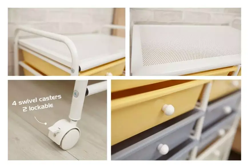عربة الأدراج خفيفة الوزن، ويمكن نقلها بسهولة إلى أي ركن من أركان المنزل. سهلة التركيب والفك، حيث تنزلق الأدراج دون تثبيت عبر قنوات معدنية. تتيح لك حاويات التخزين متعددة الألوان تنظيم أغراضك في كل درج بطريقة ممتعة وجذابة.