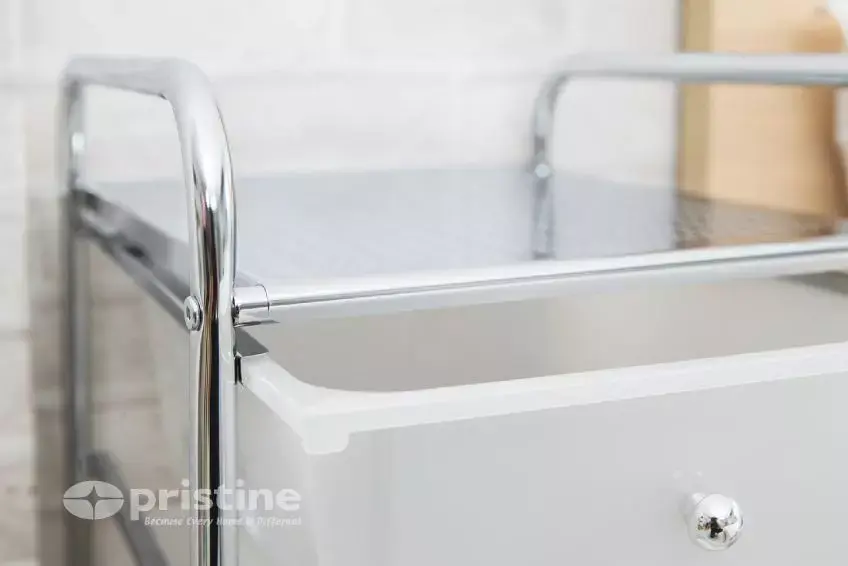 هيكل متين بإطار معدني مطلي بالكروم اللامع، مع أربعة أدراج منزلقة من البولي بروبيلين. رف معدني علوي يوفر مساحة عمل إضافية.