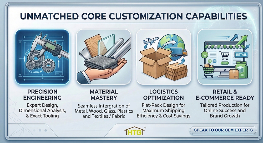 بينما يكتفي معظم الموردين باتباع الرسومات، نركز نحن على أداء منتجك. نتشارك معك لتحسين كل تفصيل، لضمان تميزه على رفوف المتاجر وصموده أمام اختبار الزمن في منزل العميل. في هوي تينغ، يتجاوز التخصيص مجرد الجماليات؛ إنه هندسة عملية تُحسّن المتانة والوظائف. نساعدك على زيادة مبيعاتك من خلال اتخاذ خيارات تصميم أكثر ذكاءً، مع الحفاظ على تكاليف الإنتاج تحت السيطرة.